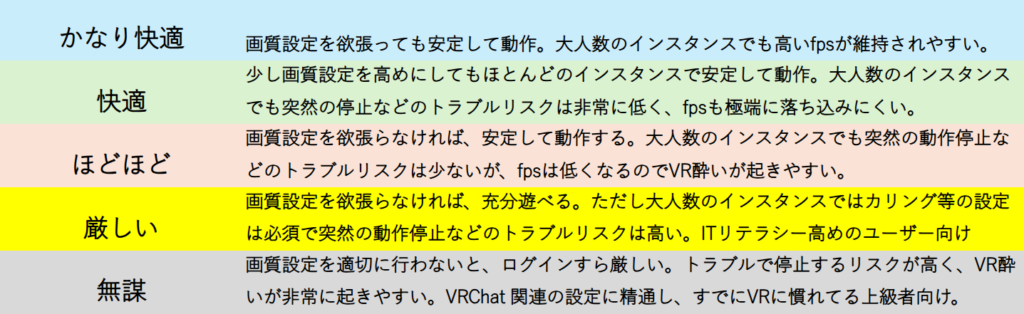 - 理由①:覚えることの負担を減らすため VRChatは操作や文化など、新しく覚えることが非常に多いです。ただでさえ大変なところに、「PCスペックの低さを設定でカバーする」という、もう一つの課題を増やしてほしくないのです。最初はなるべくシンプルに、VRChatそのものを楽しむことに集中してほしい、という願いがあります。