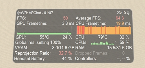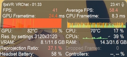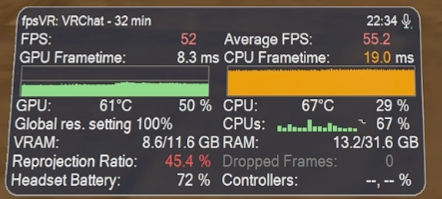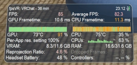 ほぼフルインスタンスの「ひまり旅館」パブリックにJoinしましたが、CPUボトルネックが発生し、GPUの性能は全く活かせない状態でした。ダウンロードサイズが50MB前後の比較的重いアバターが5人ほどいる部屋に入っても、引き続きCPUボトルネックの状態が続きました。なお、これらの重いアバターを視界に入れた状態ではVRAM使用量が11GB前後を推移しましたが、VRAM不足に起因するパフォーマンスの低下は発生しませんでした。非常に高い片目あたり解像度設定であるためVRAM使用量は高い水準を推移しましたが、特に問題なく会話を続けることができました。非常に高めの片目当たり解像度かつ、SafetyもカリングもかけずにVRAM枯渇が起こらなかったのは、区画が区切られている「ひまり旅館」のワールド仕様によるものかもしれません。