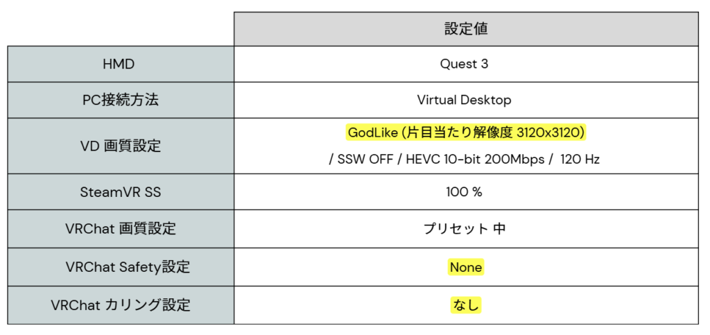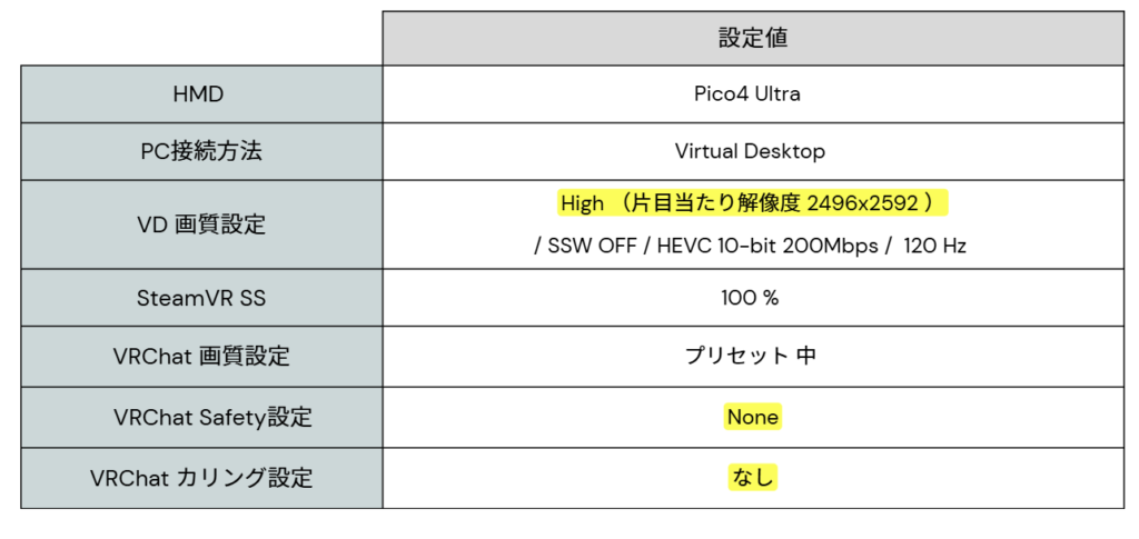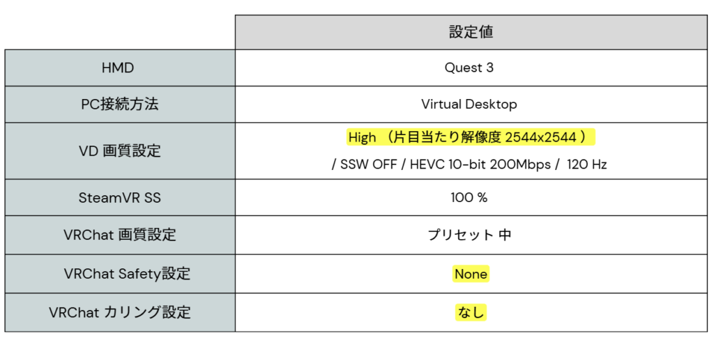 非常にGPUに負荷がかかる高画質設定で、VRChatにログインしました。Safetyもカリングの設定も一切なしであり、非常に無防備で負荷が高くなりやすい設定です。一般的にはこれらの設定は解除すべきではなく、テスト用の設定である点も留意ください。