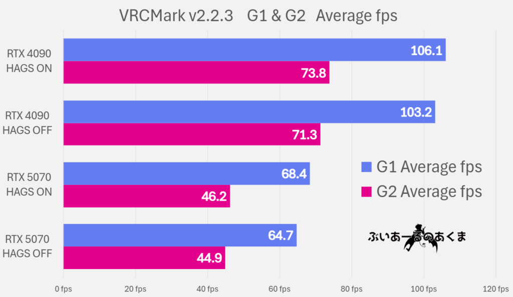 この仮説の検証をするため、HAGS ON・OFF で fps が変わるかを『VRCMark v2』で確認しました。結果としては、なんとも煮え切らない結果になった。RTX5070 において、HAGS をONにすることで、fpsの向上が確認できたが、RTX4090 でもHAGSのONでfps向上が確認された。そのため、「AMP」によるfps向上の効果があるかは、断定ができず、まだ仮説どまりとなりました。