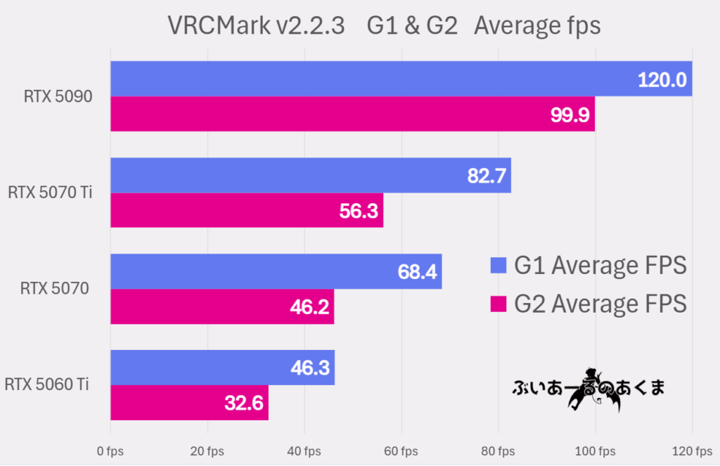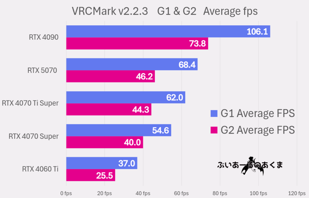 VRChat上で作成されたベンチマークワールド、『VRCMark v2』 のデータを取得しました。また、 筆者が運営しているクローズドコミュニティ『VRChat 機材研究部』でメンバーに協力いただき、様々なPC構成の結果も収集しました。『VRCMark v2』にはGPU負荷を測定するG1・G2のテストシーンがあるが、そこで取得した平均fps(Average fps)の値を使って比較を行いました。なお、CPUやその他の条件を同一にそろえて検証ができているわけではありません。しかし、CPUボトルネックが発生している可能性があるデータは除外しているうえに、ラスタライズ性能の数値とおおよその相関があることから、大きく誤った数値ではないと推測できます。