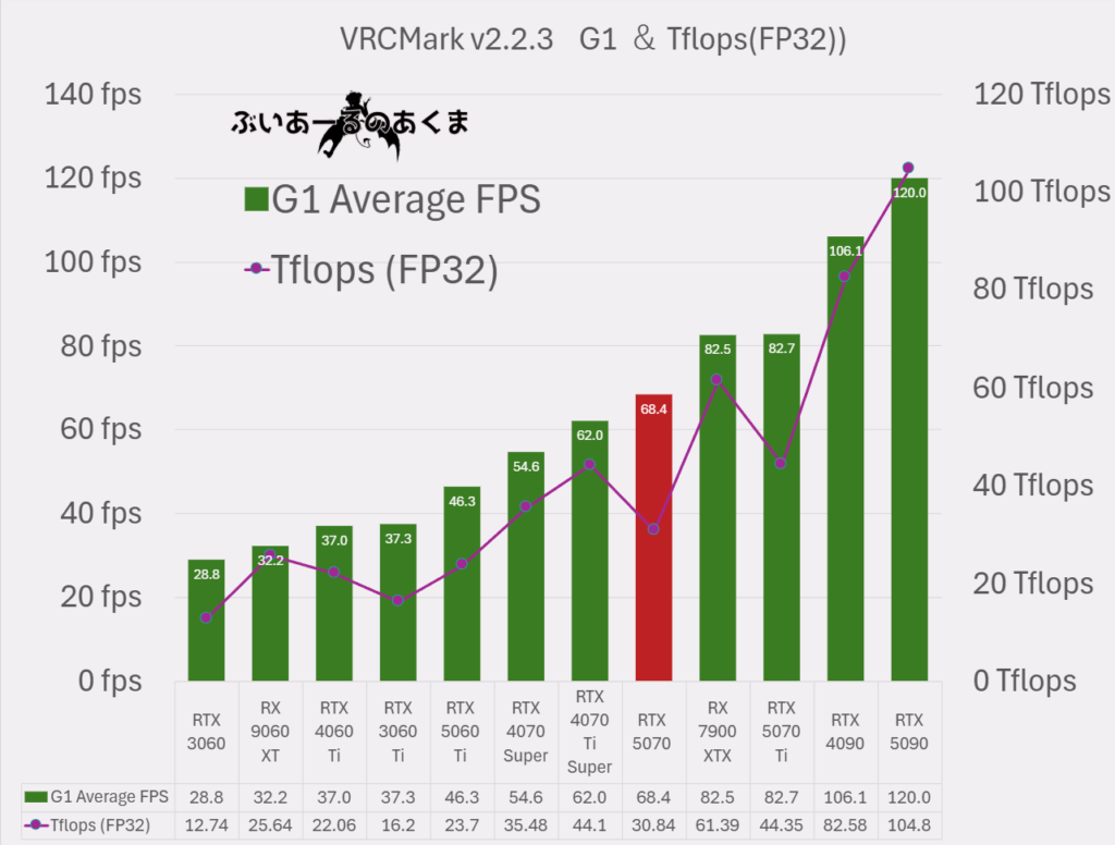 結果としては概ね期待通り、RTX 5070 は RTX5070 Ti と RTX5060 Ti のちょうど中間程度の fpsとなった。 現在、RTX5060 Ti 16GB モデルと RTX5070の価格差はおおよそ1万円である。VRAMが少し少ない点は考慮すべきポイントではあるが、20fps 以上高いfpsを発揮した点は評価できるでしょう。VRAM帯域幅の広さやCUDAコア数の増加に比例してしっかり、VRChat においても性能が出るのでしょう。