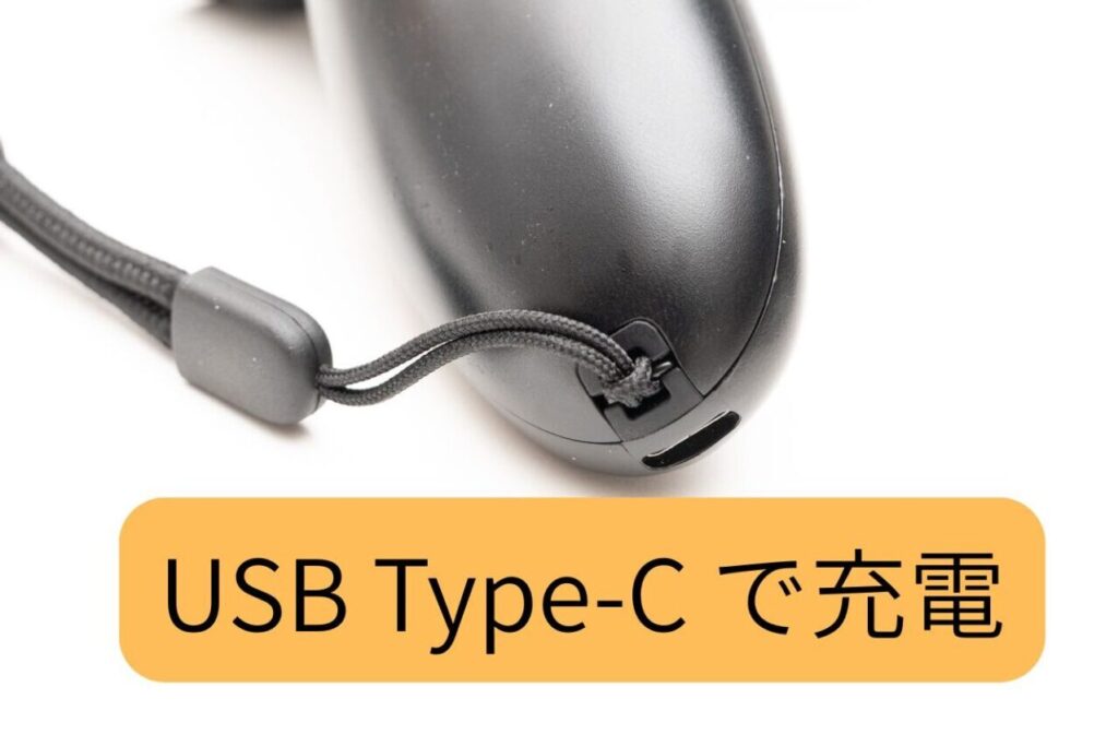 コントローラーはUSB Type-C を用いる充電式で、1回の充電で20時間ほど使用可能です。コントローラーの下側にUSB Type-C端子があります。なお、充電しながら遊ぶことも可能なので、遊びながら充電・給電も可能です。