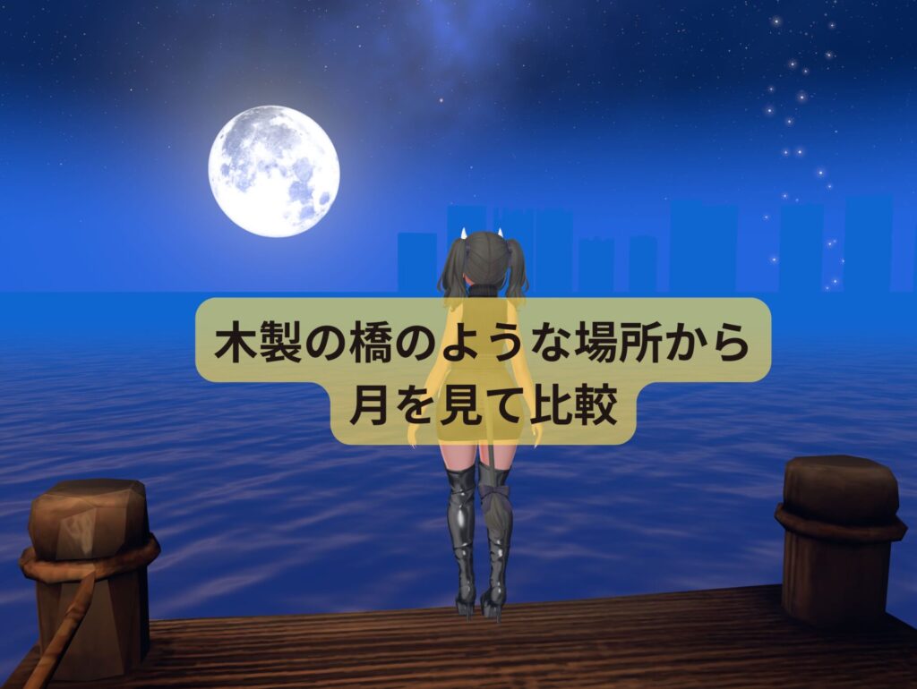 このワールドの星空と月が非常に綺麗だったため、比較用ワールドとして採用しました。このワールドでは、暗い夜空に明るい月が浮かんでいました。そのため、月を見た際に"ゴースト" や "フレア" といった現象が起きやすいことから、見え方の比較を行いました。