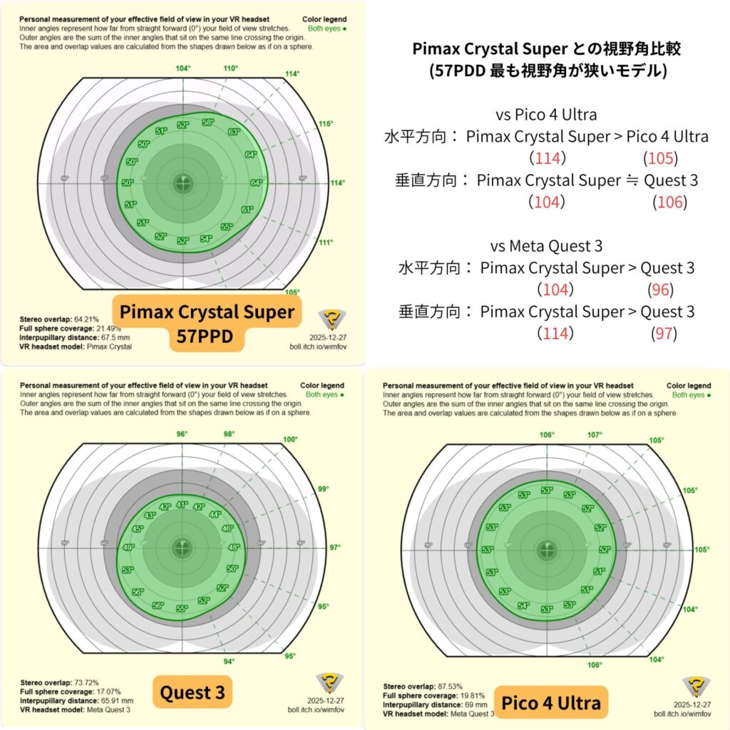 今回試用したPimax Crystal Super は57PPD モデルであり、最も視野角が狭いモデルであったが、それでもPico4 Ultra や Quest3 と比べて広い視野角があることが確認できました。Pimax Crystal Super は最も視野角の狭い57PPDモデルでも、Pico4 Ultra より水平方向に広い視野であり、Quest3 より水平垂直両方向に広い視野でした。実際の使用感としてもPimax Crystal Superは、Pico4 Ultra と比べて若干視界が広いと感じ、Quest3 と比較すると明らかに視野の開け具合が異なる印象でした
