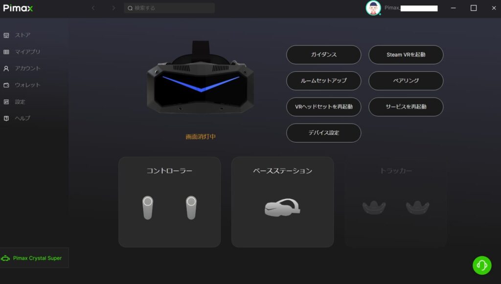 HMDとPCを連動させて動かすには、Pimax Play というソフトを利用します。Quest3や Pico4 Ultra でいうところの、"Virtual Desktop" や "Pico Connect"に相当するソフトです。Pimax Play を起動し、Pimax HMDを接続すると、画像のような画面が表示されます。初回は”ガイダンス”ボタンを押して、案内に従ってセットアップすれば初期設定が完了します。