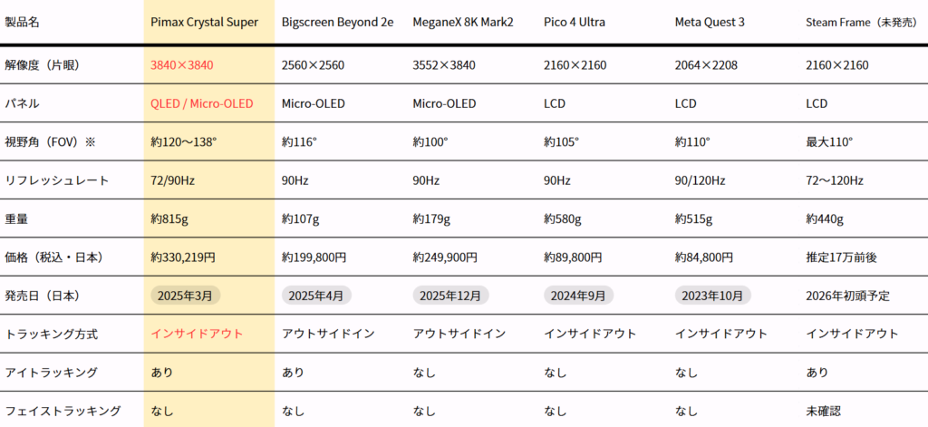 現在販売されている主要なHMDとも比較すると、Pimax Crystal Super はインサイドアウト方式かつ、高解像パネルの高画質を両立した唯一のHMDであることがわかります。Pimax Crystal Super は価格や重量の観点では他の主要なHMDと比べて劣っています。ただし、Bigscreen Beyond 2e や MeganeX 8K Mark2 は別途コントローラーやBase Station の購入が必須です。そのため、実際に比較検討する場合は、それらも含めた金額で比較検討が必要です。