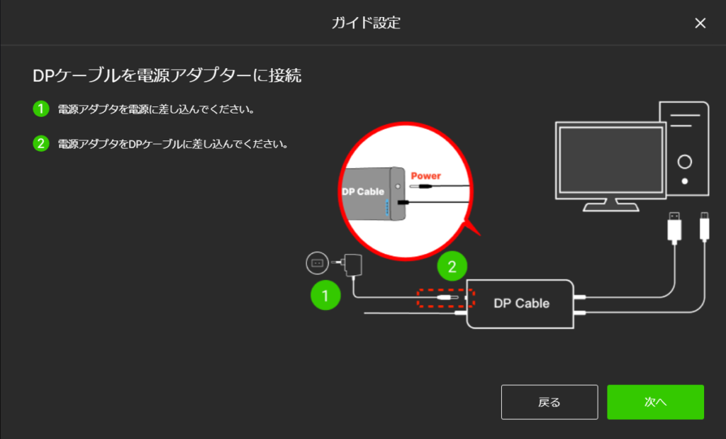 - 接続ケーブルは1本のみ(DisplayPort・USB・電源に分岐)