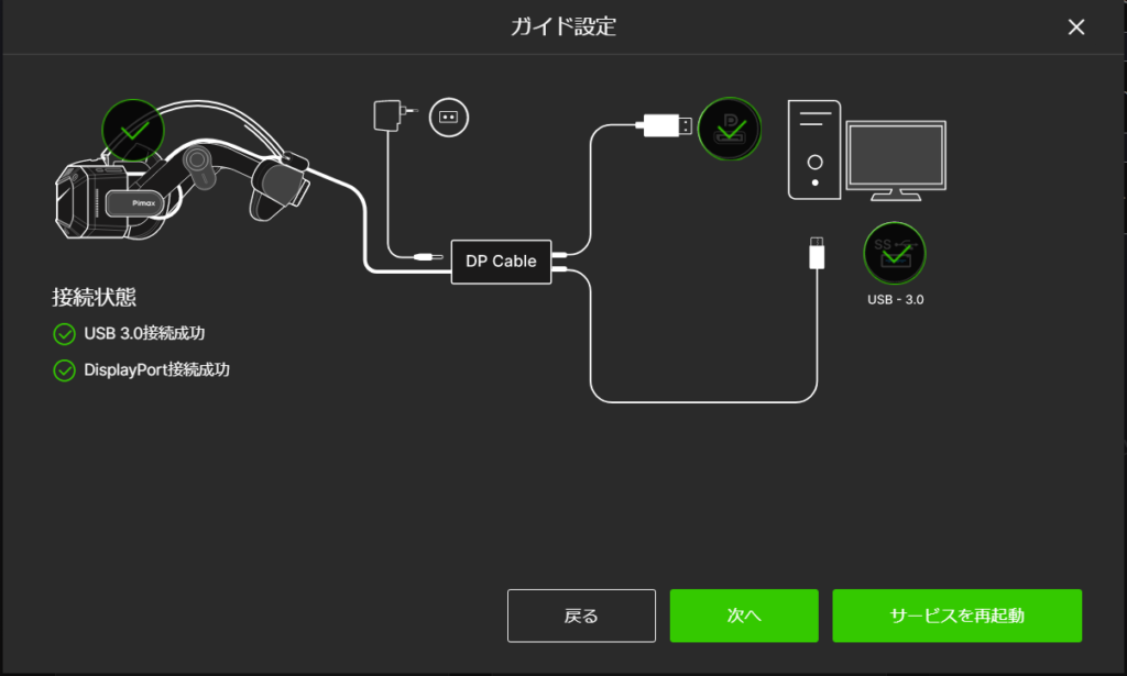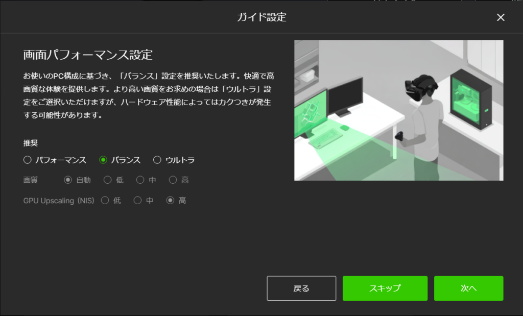 Pimax Play は設定項目は多いものの、最低限の設定は前述の”ガイダンス”ボタンから実施できるため、想像以上に簡単でした。