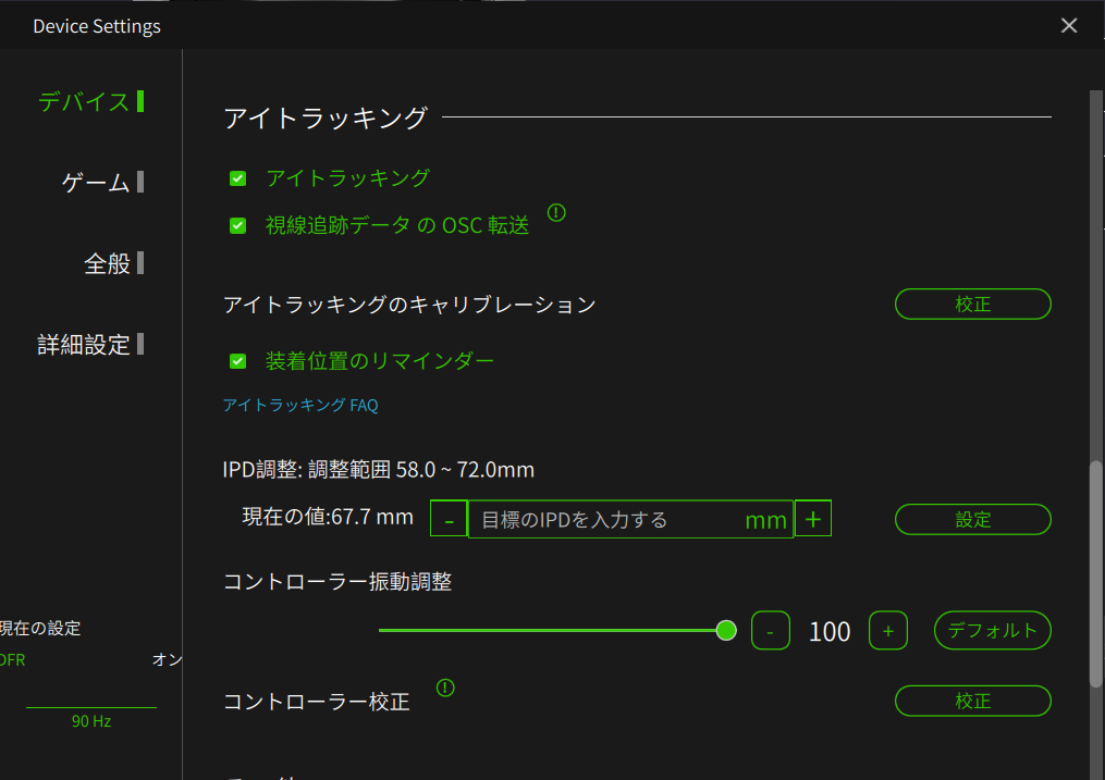 ”デバイス設定” に入ると画質設定や IPD 設定など細かい設定が可能です。Upscaling 機能やフォービエイテッドレンダリングといった画質設定が可能で、設定項目だけでも非常に遊びがいがあります。